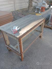 vendo vecchio banco da lavoro in legno rinforzato con angolari di ferro... dopo una bella pulita potrebbe essere usato anche come arredamento e piano di appoggio per negozi... le misure sono 600x1250 altezza 780...
