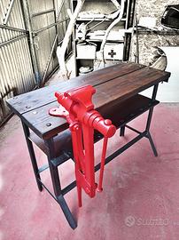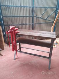 restauro banco da lavoro in ferro con morsa a balestra funzionante, legno recuperato in abete massello