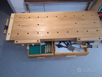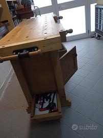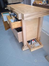 Banco classico da falegname in massello di faggio, di dimensioni 140 x 50 cm con altezza 90 cm, dotato di tre morse. Il contenitore sottostante, ad incasso, è fornito di due cassetti, un vano chiuso, un vano aperto ed un secretaire. NB non spedito per dimensione e peso, solo ritiro.
