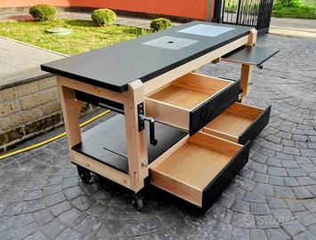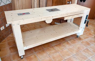 Banco da lavoro falegname con morsa parallela e piano singolo o doppio a filo in acciaio per predisposizione fresatrice e rifilatore, sottopiano , ruote con freno , piano estraibile o tassello estraibile per appoggio pezzo in morsa, possibilità di cassetti. Realizzazione artigianale in legno massello, ideale per lavori di hobbistica e per falegnameria. Misure piano 60x200 sp.28mm, altezza da terra 93 cm: Banco rettangolare piastra singola: Euro 420 Banco rettangolare piastra doppia: Euro 450 Banco a sbalzo piastra singola: Euro 390 Misure piano 80x200 spessore 4cm con piastra doppia e morsa: Euro 540 Misure piano 80x160 spessore 4cm con piastra singola e morsa: Euro 480 Misure piano 70*200 spessore 4 cm con piastra singola, morsa doppia e 3 cassetti: € 620 Misure piano 80x200 spessore 4 cm con piastra doppia, morsa doppia, tre cassetti e pianetto estraibile: € 680 La piastra in acciaio è in predisposizione al fissaggio di una fresatrice verticale e rifilatore per legno o una sega circolare. (montaggio degli utensili non compreso, a cura dell'acquirente) Posso consegnare in tutto il Lazio a prezzi molto modici. Solitamente è pronto per la consegna, se non disponibile si realizza su commissione in pochi giorni. info 3357299966 whatsapp Alessandro.