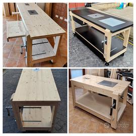 Banco da falegname tavolo da lavoro 70*200 con 2 cassetti, ruote, doppio ripiano, struttura in massello e lamellare.