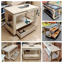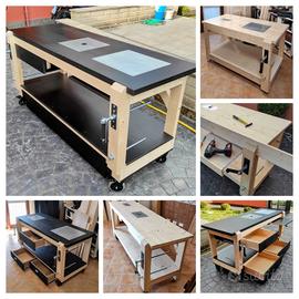 Banco da lavoro falegname con morsa parallela e piano singolo o doppio a filo in acciaio per predisposizione fresatrice e rifilatore, sottopiano , ruote con freno , piano estraibile o tassello estraibile per appoggio pezzo in morsa, possibilità di cassetti.