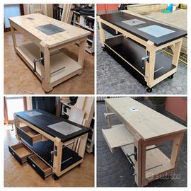 Banco da lavoro falegname con morsa parallela e piano singolo o doppio a filo in acciaio per predisposizione fresatrice e rifilatore, sottopiano , ruote con freno , piano estraibile o tassello estraibile per appoggio pezzo in morsa, possibilità di cassetti. Realizzazione artigianale in legno massello, ideale per lavori di hobbistica e per falegnameria. Misure piano 60x200 sp.28mm, altezza da terra 93 cm: Banco rettangolare piastra singola: Euro 420 Banco rettangolare piastra doppia: Euro 450 Banco a sbalzo piastra singola: Euro 390 Misure piano 80x200 spessore 4cm con piastra doppia e morsa: Euro 540 Misure piano 80x160 spessore 4cm con piastra singola e morsa: Euro 480 Misure piano 70*200 spessore 4 cm con piastra singola, morsa doppia e 3 cassetti: € 620 Misure piano 80x200 spessore 4 cm con piastra doppia, morsa doppia, tre cassetti e pianetto estraibile: € 680 La piastra in acciaio è in predisposizione al fissaggio di una fresatrice verticale e rifilatore per legno o una sega circolare. (montaggio degli utensili non compreso, a cura dell'acquirente) Posso consegnare entro 250km da Roma a prezzi modici. Solitamente è pronto per la consegna, se non disponibile si realizza su commissione in pochi giorni. info 3357299966 whatsapp Alessandro.