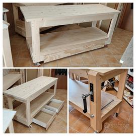 Banco da lavoro falegname con morsa parallela e piano singolo o doppio a filo in acciaio per predisposizione fresatrice e rifilatore o per inserire sega circolare, sottopiano , ruote con freno , piano estraibile o tassello estraibile per appoggio pezzo in morsa, possibilità di cassetti. Realizzazione artigianale in legno massello, ideale per lavori di hobbistica e per falegnameria. Misure piano 60x200 sp.28mm, altezza da terra 93 cm: Banco rettangolare piastra singola: Euro 420 Banco rettangolare piastra doppia: Euro 450 Banco a sbalzo piastra singola: Euro 390 Misure piano 80x200 spessore 4cm con piastra doppia e morsa: Euro 540 Misure piano 80x160 spessore 4cm con piastra singola e morsa: Euro 480 Misure piano 70*200 spessore 4 cm con piastra singola, morsa doppia e 3 cassetti: € 620 Misure piano 80x200 spessore 4 cm con piastra doppia, morsa doppia, tre cassetti e pianetto estraibile: € 680 La piastra in acciaio è in predisposizione al fissaggio di una fresatrice verticale e rifilatore per legno o una sega circolare. (montaggio degli utensili non compreso, a cura dell'acquirente) Posso consegnare entro 250 km da Roma a prezzi molto modici. Solitamente è pronto per la consegna, se non disponibile si realizza su commissione in pochi giorni. info 3357299966 whatsapp Alessandro.