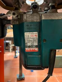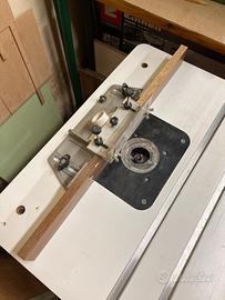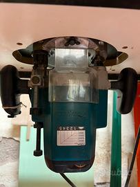 Banco fresa usato poco e tenuto con cura, completo di fresatrice Makita 3612C e vari accessori tra cui la guida di battuta regolabile, bocchetta di aspirazione e impianto elettrico (autocostruito) con pulsante start e stop frontale.