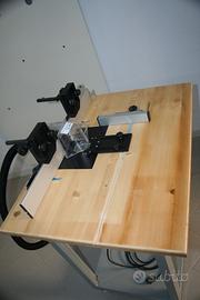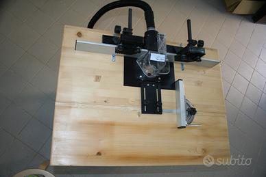 Banco per fresare, piano di lavoro cm 80 x 70 con guida goniometrica scorrevole e pressori a servizio delle lavorazioni, dotato di tutti gli accessori a corredo in alluminio, completo di condotti di aspirazione trucioli e polvere, montato su struttura molto stabile in tubolari di acciaio, fornito con fresatrice di potenza 1200 watt e velocità regolabile.