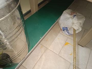 Vendesi banco in metallo autocostruito per facilitare lo svuotamento dell'olio dai bidoni.
