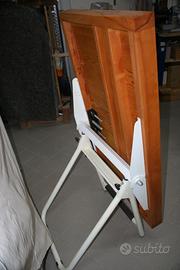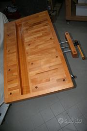 Banco da lavoro chiudibile, con piano interamente in massello di faggio. Il banco da falegname, di dimensioni cm 75 x 130, è dotato di morsa e vano portautensili. La struttura di supporto, in solido tubolare di acciaio, consente la regolazione dell’altezza di lavoro da 89 a 119 cm, permette l’inclinazione del piano di lavoro e dà la possibilità di richiuderlo completamente.