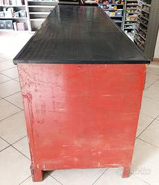BANCONE LEGNO ANNI 70 CON 6 FILE CASSETTI - LUNGHEZZA 290 CM PROFONDITA 80 CM ALTEZZA 98 CM - PARTE FRONTALE CON ADESIVI AUTO MOTO E BICI - PIANO APPOGGIO RIVESTITO CON TAPPETO GOMMA E BORDO PERIMETRALE IN METALLO