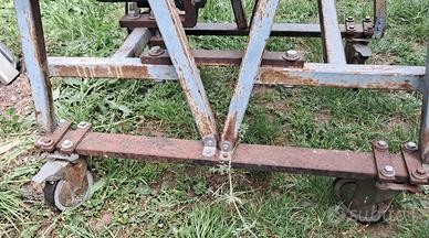 Vendo banco sega artigianale robusto struttura in tubolari di ferro, ,ruote piroettanti con fermo altezza taglio 10 cm circa . Misure totali 80 x 80 x 100 cm