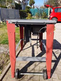 Banco sega troncattice, fabbricazione tedesca, elettrico, completo di lama troncatrice 315 mm 0,30 mm,6mm, maniglie, ruote per spostamenti. Sistema di regolazione taglio, regolabile max 8 cm. Alimentazione 230 volt 2000 watt 2800 giri minuto, indice protezione IP44. Il bordolama in plastica è stato riprogettato e ricostruito con equivalente in acciaio. Il Banco è stato usato poco, è sicuro e affidabile. Vendo per inutilizzo a causa trasferimento all'estero. Visto e piaciuto con ritiro in posto, non spedisco, astenersi perditempo.
