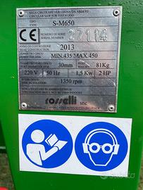 Si tratta di un banco sega a protezione scorrevole Rosselli S-M650 o S-M655, una sega circolare per tagliare rami e tronchi di legno.