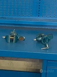 Bancone da lavoro in acciaio, comprensivo di rastrelliera smontabile, due cassetti, piano d'appoggio inferiore e due morse in acciaio. DIMENSIONI: lunghezza 2 m. - altezza 1,70 m. - profondità 80 cm.
