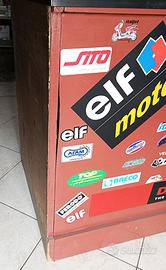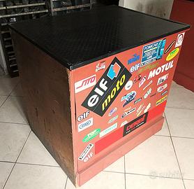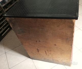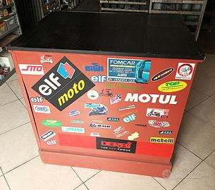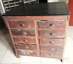 BANCONE LEGNO ANNI 70 CON 10 CASSETTI IN BUONE CONDIZIONI - PRESENTI GRAFFI TAGLI E PARTI CONSUMATE - LARGHEZZA 99 CM PROFONDITA 76 CM ALTEZZA 99 CM - PARTE FRONTALE CON ADESIVI AUTO MOTO E BICI - PIANO APPOGGIO RIVESTITO CON TAPPETO GOMMA E BORDO PERIMETRALE IN METALLO - PANNELLO LATERALE DESTRO IN TRUCIOLATO