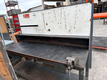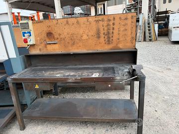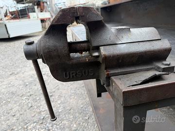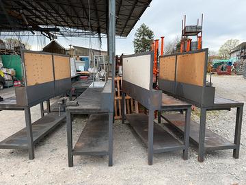N. 7 banconi da lavoro in metallo pesante con morsa (da 100 o 120) e pannello postreiore porta attrezzi. Misure: h180 p70 L200. Il pannelli superiore può essere smontato. Il piano è in metallo ricoperto da gomma antiscivolo anti olio. Ritiro di persona o con corriere proprio.