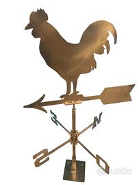 Gallo galletto segnavento in ferro pesante color sfumato ottonato. Dotato di asse per muoversi liberamente, di asta e base per il fissaggio nel cemento, sul tetto oppure sul balcone. Completo di Punti cardinali prodotto artigianale Dimensioni: Altezza totale 82cm, 46 cm x 46 cm N.B. qualche piccola imperfezione o diversità conferma il prodotto fatto a mano