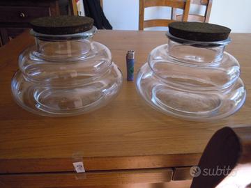 Barattoli in vetro soffiato di Empoli si notano le imperfezioni della lavorazione artigiana ad esempio le bollicine ...........misure: altezza cm. 14 diametro alto utile cm. 10 diametro parte più larga cm. 22.