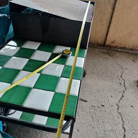 causa inutilizzo vendo barbecue a carbonella/legna con cassetto inferiore estraibile, struttura e coperchio in ferro,rivestimento ripiani con mattonelle laccate verde/bianco,ruote per lo spostamento funzionanti. Oltre al piano griglia originale includo due griglie richiudibili .Ingombro 110x50 ,altezza piano di lavoro 65, griglia 50x50x20. Coperchio leggermente ossidato