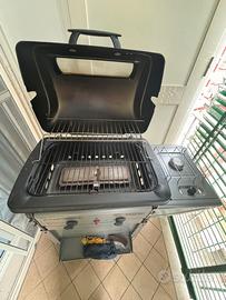 Vendesi barbecue a gas Campingaz Expert Deluxe con pietra lavica: - parte principale composta da 2 bruciatori in acciaio alluminato, con pietra lavica e caperchio con parte in vetro per ispezione; -parte secondaria a lato con 1 bruciatore per riscaldare salse o contorni; -grill con accensione piezoelettrica -griglia in ghisa per BBQ (55 x 33 cm), grata riscaldata estesa per tutta la superficie di cottura; -il BBQ è corredato già di pietre laviche Campingaz che consentono la distribuzione del calore per tutta la superficie del grill e proteggono dal grasso che cola; scaffale + lato pieghevole, rotelle bloccabili per riporre il grill se non in uso; ampio spazio nel ripostiglio inferiore. Specifiche: coperchio in acciaio con finestra e termometro (per grigliare in modo indiretto). Nella vendita e’ inclusa anche la bombola.