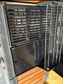 11,4 kW • 1 griglia di cottura smaltata: 45,2 x 28,5 cm • 1 piastra di cottura smaltata: 45,2 x 28,5 cm • Griglia cromata articolata: 57,6 x 16,1 cm • 3 bruciatori in ghisa a tenda • Optional: cestello roccia lavica*• Accensione: Piezo elettronica • Coperchio/forno pivottante con indicatore di temperatura • 1 vassoio estraibile a scomparsa per la raccolta dei grassi • Dimensioni: h 110 x p 61 xl