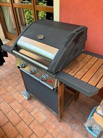 CAMPINGAZ GENESCO 3 WOODY L. SISTEMA DI COTTURA AUSTRALIANO. Il sistema di cottura australiano si compone di un bruciatore in ghisa a tenda che permette di cucinare qualsiasi pietanza, ed inoltre riesce a raggiungere potenze elevate in maniera molto veloce. DOTAZIONI Il barbecue è dotato di 3 bruciatori. Il carrello in legno con profili in acciaio smaltatoe finiture in acciaio inox, dispone di un copribombola rigido, inoltre sono presenti 2 grandi ruote per agevolarne lo spostamento. Due ripiani di lavoro in legno. Il coperchio integra un comodo termometro per la gestione delle temperature di cottura. AREA DI COTTURA L'area di cottura si compone per metà di una griglia in ghisa smaltata e per l'altra metà di una piastra in ghisa smaltata, e la sua dimensione permette di cucinare per molte persone contemporaneamente. CARATTERISTICHE TECNICHE: • Potenza: