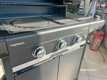 Barbecue a gas 3 fuochi. Griglia e piastra in ghisa smaltata. Sistema di cottura in acciaio inox. Con sistema InstaClean e Culinary Modulars. Grazie al nuovo design della superficie di cottura vi è una visibile riduzione delle fiammate. Potente fornello laterale integrato.