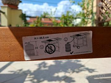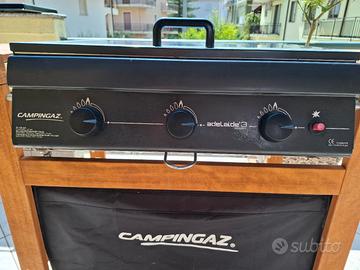 Barbecue Campingaz modello Adelaide 3 Woody a gas GPL con scocca in legno e ruote in plastica dura per lo spostamento, griglia e piastra (60×46 cm in totale) entrambe in ghisa servite da 3 bruciatori a tenda modello australiano con accensione indipendente. Piezoelettrico per accensione immediata, potenza massima ai fuochi 14 kW, 2 ripiani laterali in legno, vano portabombole, coperchio paraschizzi e coprifuochi, vassoio di recupero grassi estraibile e lavabile in alluminio. Frontale in tessuto lavabile e telo di copertura protettivo inclusi. Dimensioni totali: 128x49x88 cm.