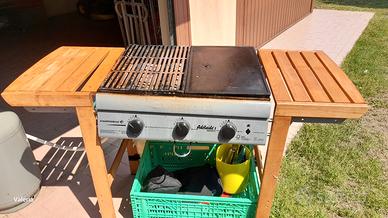 Barbecue a gas GPL, con coperchio, carrello in legno x esterno, accensione con Piezoelettrico , doppia fornitura di pietra lavica per migliore cottura più omogenea due griglie