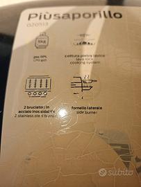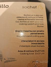 barbecue a gas con piano di cottura in pietra lavica, superficie di cottura 52x 37 cm. due bruciatori in acciaio inossidabile, un fornello laterale, fornito di ruote e di telo di copertura