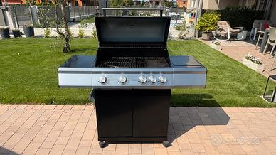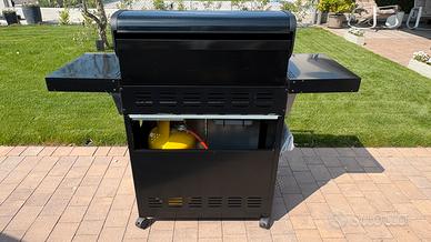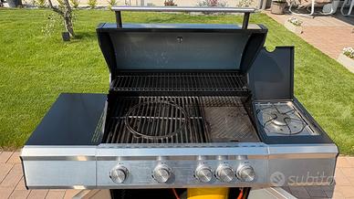 Vendo Barbecue a gas 4 fuochi + 1 esterno, completo di bombola di gas ( da finire e poi utilizzare come bombola per cambio) e accessori vari sotto elencati: 4 reti e tappetini antiaderenti 1 set di spazzole per pulizia 1 set per marinatura 2 griglie per pesce 1 griglia per polenta 2 griglie per carne 1 piastra per pizza per barbecue 1 telo di copertura. Vendo per poco utilizzo; usato max 5 volte da quando l’ho comprato. Vendo a 450 euro trattabili con consegna presso la mia abitazione. Altre foto degli accessori disponibili su richiesta