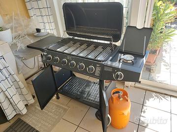 Vendo barbecue a gas con 6 bruciatori in acciaio e un fornello laterale, usato pochissimo e sempre tenuto al coperto.