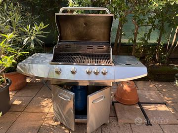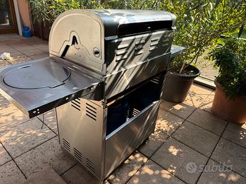 Barbecue a gas Lunghezza totale 147, profondità 60. Dimensioni griglia 70x45 con 4 bruciatori Fornello laterale diametro 30 Griglia di riscaldamento 70x18 A sx ripiano laterale 36x60 Contenitore sotto griglia per bombola gas e attrezzi (73x48) con 2 porte Ruote per trasportarlo