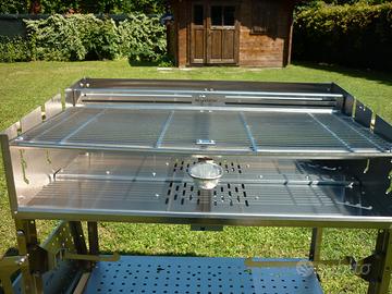 composto da: barbecue modello 100, coperchi/ripiani laterali, Accenditore per carbonella XL (8kg), Vasca cuoci Arrosticini A100, Vasca cuoci Spiedini S100, Griglia di cottura inox x griglia spiedini (Grigliotto 100), Pietra ollare con telaio inox P100