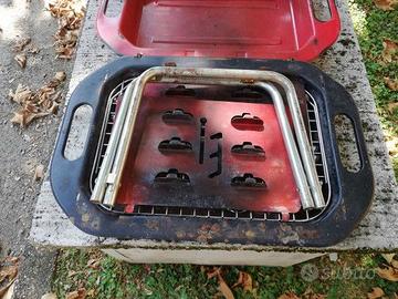 Barbecue a carbonella cm 40x30 smontabile e richiudibile a valigetta , di robusta lamiera stampata e verniciata a fuoco , con una griglia mobile in 3 posizioni e una griglia per il mantenimento a caldo degli alimenti , usata ma in buone condizioni In aggiunta una griglia richiudibile a libro per poter grigliare i cibi senza doverli girare ad uno ad uno Contattare Fausto al anche in voce o whatsapp