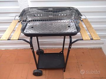 Barbecue in acciaio fissato su struttura a carrello metallico con due ruote in plastica.