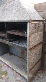 BBQ artigianale in ferro e pietra, con piastra e griglia regolabile.
