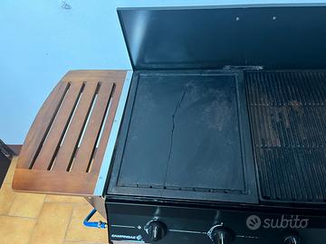 Vendo per realizzo: – Barbecue Marca Campingaz – Modello Adelaide 4g – Alimentazione GPL/metano – Con ruote – Carrello in legno Pistre utilizzabile ma presente crepa (foto 4) Kit ricambio piastre in vendita a c.a. 70€ sul web