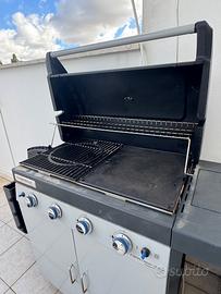 Barbecue con metodo di cottura australiano, composto da una parte in piastra di ghisa e da una parte griglia ,
