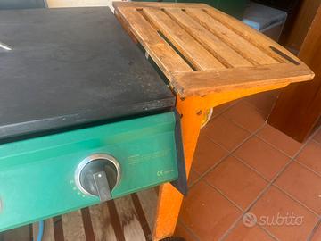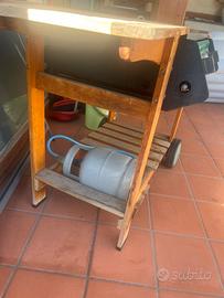 Barbecue tre bruciatori, alimentazione a gas con bombola, accenzione bizzo, una griglia e un piastra, due piani di lavoro, porta bombola