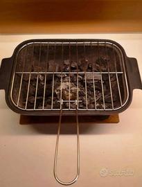Braciere da tavolo in pesante ghisa, per cucinare e tenere in caldo. Dotato di griglia con manico retrattile e legnetto che isola dal piano.