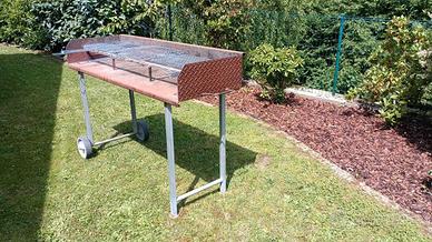 La struttura poggia su quattro gambe in metallo robuste, di cui due dotate di ruote per facilitare lo spostamento anche su superfici erbose. Il design è semplice ma funzionale, con un aspetto rustico dato dalla leggera ossidazione della vasca, che testimonia un’elevata resistenza al calore.