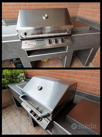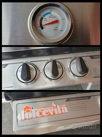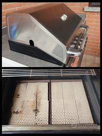 LEGGERE BENE Per cambio progetto vendo barbecue Dolcevita Turbo 3 Classic, prodotto da azienda italiana certificata. Il modello Turbo 3, che ha una dimensione intermedia, oggi non è più prodotto ed ora sono disponibili solo i modelli a 2 fuochi (piccoli?) oppure a 4 o 6 fuochi (grandi?). E' stato utilizzato in tutto 4/5 volte, in conformazione da incasso, (spazio necessario L x P x H = 62,5 x 52 x 30 cm) sempre in luogo coperto e sempre pulito a fondo dopo ogni utilizzo. E' anche possibile collocarlo su un carrello predisposto, come ad es. i carrelli CDE 4/5 o Jarrah 2-3-4 (sentire l'azienda Dolcevita). Accensione piezoelettrica integrata, con 3 bruciatori per un potenza totale di 15,6 KW. E' predisposto per l'alimentazione a gas metano di casa, ma è possibile convertirlo a gas gpl (bombola) con il kit regolatore di pressione e gli ugelli di trasformazione (per un costo di meno di 50 € in totale: informarsi sul sito Dolcevita). Griglia a "V" capovolta in ghisa rivestita di smalto opaco porcellanato sottoposto a 800°C, così come la piastra in dotazione. Superficie di cottura totale 65 x 49 cm. Seconda griglia in dotazione per aumentare la superficie di cottura, nuova, ancora nel cellophane. Griglia scaldavivande e vaschetta raccogligrasso incluse. Funziona sia con roccia lavica sia con mattonelle ceramiche, entrambe incluse e per metà ancora praticamente nuove, come da foto. Tutto il barbecue è in acciaio inox, compresa la cappa a doppio isolamento con termometro incorporato per cotture precise, anche indirette, anche a coperchio chiuso. Il barbecue è stato interamente pulito a fondo ed è pronto per l'utilizzo. ma essendo stato tolto dalla sua collocazione originaria è scollegato dal gas e non può essere provato sul posto, disponibili video a testimonianza funzionamento. In regalo valigetta con accessori per cucinare e incluso manuale di istruzioni. Viste dimensioni e peso ritiro solo in loco. Astenersi per favore perditempo e affaristi.