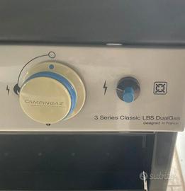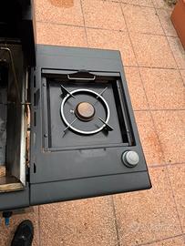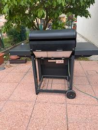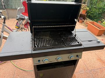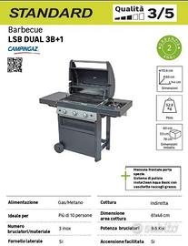 Barbecue a gas con 3 bruciatori principali in acciaio inox e formello laterale. Potenza 9,6KW. Dimensioni area cottura 61x46cm. 2 ripiani laterali di cui uno pieghevole. Coperchio con termostato. Indicato per 8/10 persone. Adatto per il trasporto grazie alle 2 ruote.