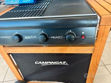 Barbecue Dual Gas (Butano o Metano) 3 fuochi con piastra e griglia in ghisa smaltata. Sistema di cottura con bruciatore doppio in ghisa.