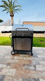Barbecue gas gpl in acciaio inox con piastra e griglia in ghisa, con fornello laterale e porta teglia e coperchio uso forno.
