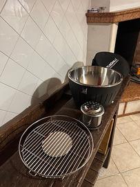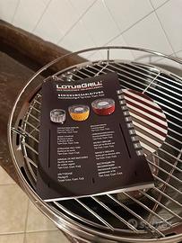 Barbecue a carbonella con sistema di ventilazione brevettato, griglia pronta in soli 4 minuti, cottura senza fumo in quanto il grasso non sgocciolerà sulla carbonella. ideale per l'uso sul balcone senza infastidire i vicini, ottimo in campeggio in quanto facilmente trasportabile nella sua borsa. Tutti componenti in acciaio inox lavabili in lavastoviglie.