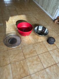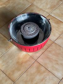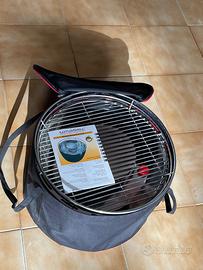 Peso: 6,5 kg Dimensioni: diametro superiore circa 435 mm, diametro inferiore circa 350 mm, altezza circa 257 mm, diametro griglia circa 405 mm. Materiale: acciaio verniciato a polvere, base metallica griglia, vasca interna, contenitore per carbonella e chiusure di sicurezza, acciaio inox.