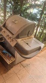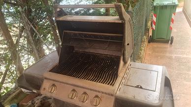 Grande Barbecue Napoleon a Gas con struttura tutto acciaio inox, zona centrale con grande griglia in acciaio inox, al lato sinistra ottimo ripiano di appoggio, al lato destra ultere piano di appoggio con inserito un piano cottura, le portineria sotto nascondono il vano porta bombola. Dotato di coperchio di chiusura con termometro. Lo vendo così com'è in foto, necessita di pulizia generale e vendo con SOLO ritiro a mano NO spedizione.