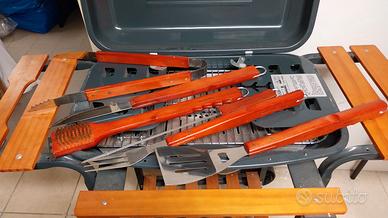 Barbecue in acciaio verniciato completo di coperchio e carrello + set per barbecue Brandani, composto da 6 pezzi in acciaio con manico in legno