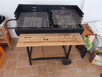 Barbecue con due contenitori per la brace, quindi possibilità di cuocere contemporaneamente cose diverse con diverso calore. Infine un comodo piano d' appoggio per i piatti ed uno sottostante per la carbonella o altro materiale e provvisto di ruote per facili spostamenti.